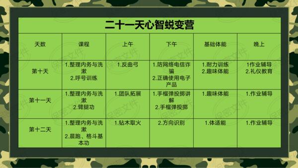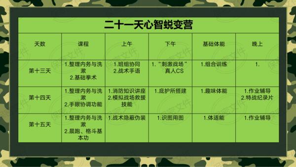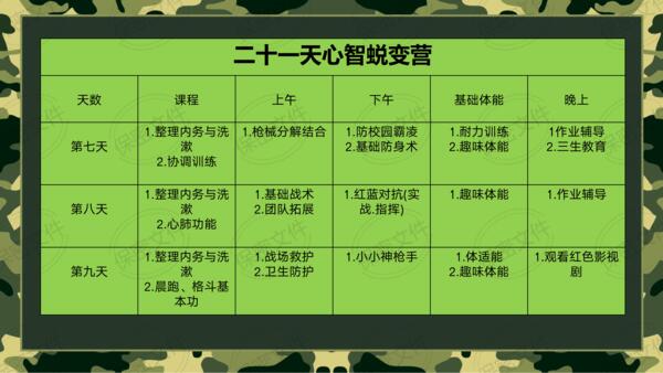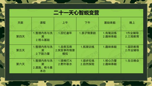 ·基础体能课程·综合障碍训练·趣味体能竞赛·紧急集合与行军拉练。施训并行,家庭教育结合军事训练。玩中学,学中玩,掌握家庭和学校学不到的知识和技能。提升综合能力:身体素质,动手能力,生存能力,想象力,抗压能力等,释放天性,亲近自然。