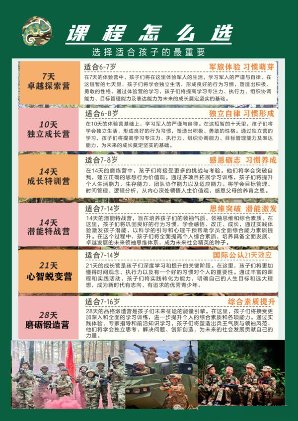 ·基础体能课程·综合障碍训练·趣味体能竞赛·紧急集合与行军拉练。施训并行,家庭教育结合军事训练。玩中学,学中玩,掌握家庭和学校学不到的知识和技能。提升综合能力:身体素质,动手能力,生存能力,想象力,抗压能力等,释放天性,亲近自然。
