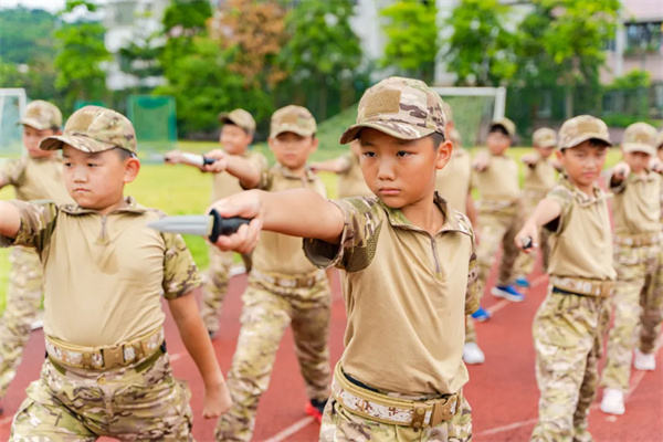课程包含单兵队列动作、战术手语训练、轻武器认知课程等标准化军事训练,每日设置2小时高强度训练,通过严格队列动作和战术技巧培养孩子的纪律性和意志力。
